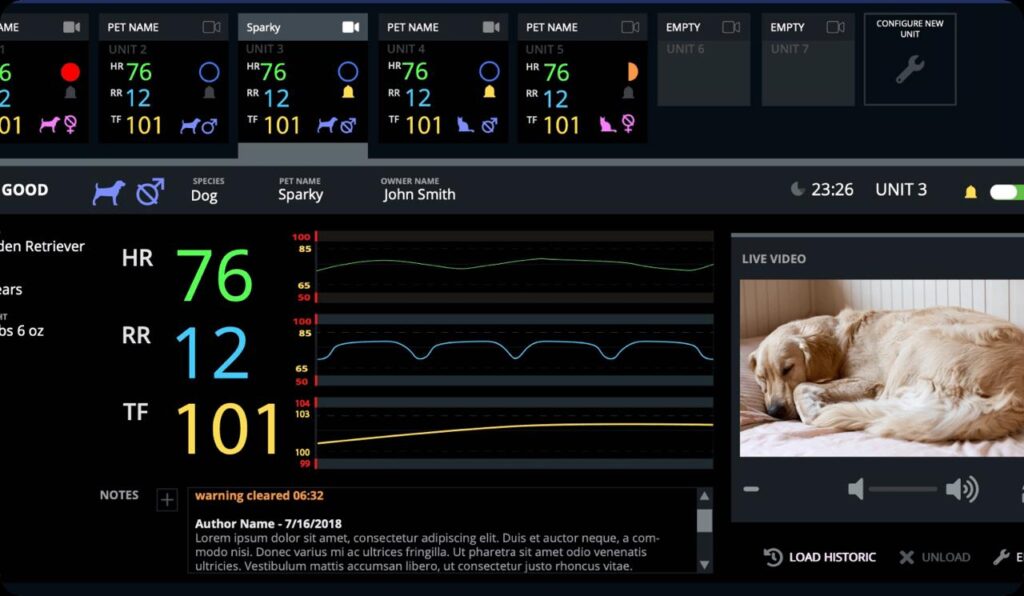 VetGuardian is the only zero touch remote telemonitor for veterinarians. VetGuardian is the perfect tool for post-surgical, overnight, and ICU animal patient monitoring. VetGuardian continuous Monitoring Application which detects temperature, pulse, and respiration with live video. Access the data and live feed on any smart device connected to internet.